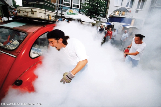 What a bloody massacre! Two tourist splatter everything they can get their hands on. Starting to grumpy attitudes on up to the most favourite vehicle in the world: the 2CV. It smokes, it bangs and causes a commotion. The boot-lid opens the boot-lid close. The 2CV collapses and the mood improvise histerically. Both characters scurry around at a hectic pace, and entangle the onlookers in a indescribable disaster.