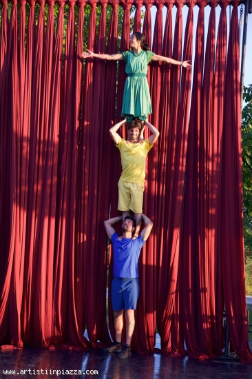 Three performers — accompanied by the live music of Fabio Guandalini, who takes an active part in the performance — are on a quest for something humanity has long lost: the spontaneous happiness of the present moment.